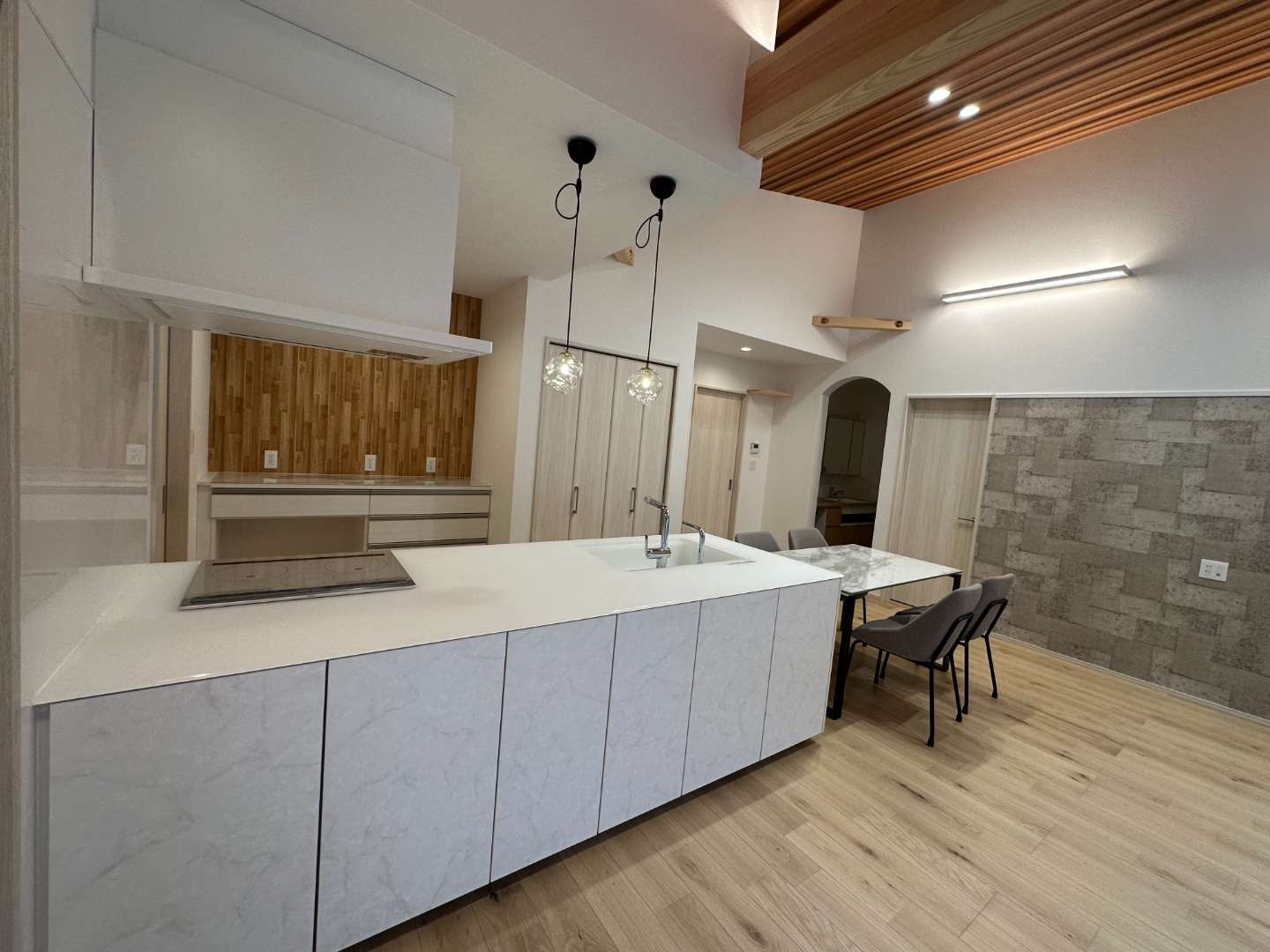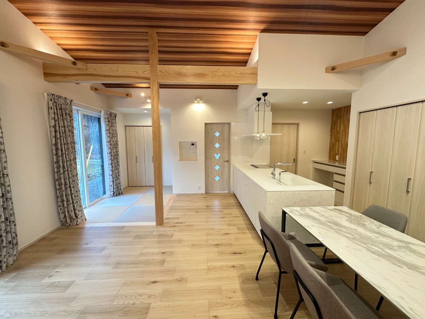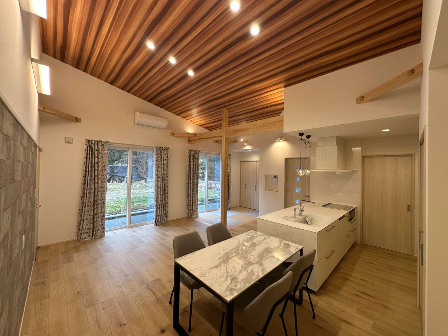 戸建て 注文住宅 真庭市 開放的なLDKの平屋 ウォークインクローゼットとランドリールームはリビングからの回遊動線で繋がる洗面コーナーは単独のスペースとして設計トイレも来客用と家族用として2か所配置大きな子供室は将来分割できるように計画LDKは畳コーナー含め約23畳あり、吹き抜けにすることでさらに開放的に 場所 岡山県真庭市 1 / 1 前の施工事例 戸建て 真庭市 LDKリフォーム